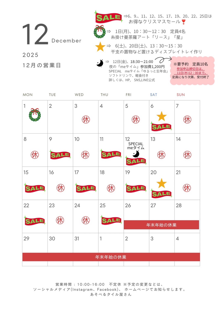 12/6(土)、9(火)、11(水)、12(木)、15(月)、17(水)、19(金)、20(土)、22(月)、25(木)